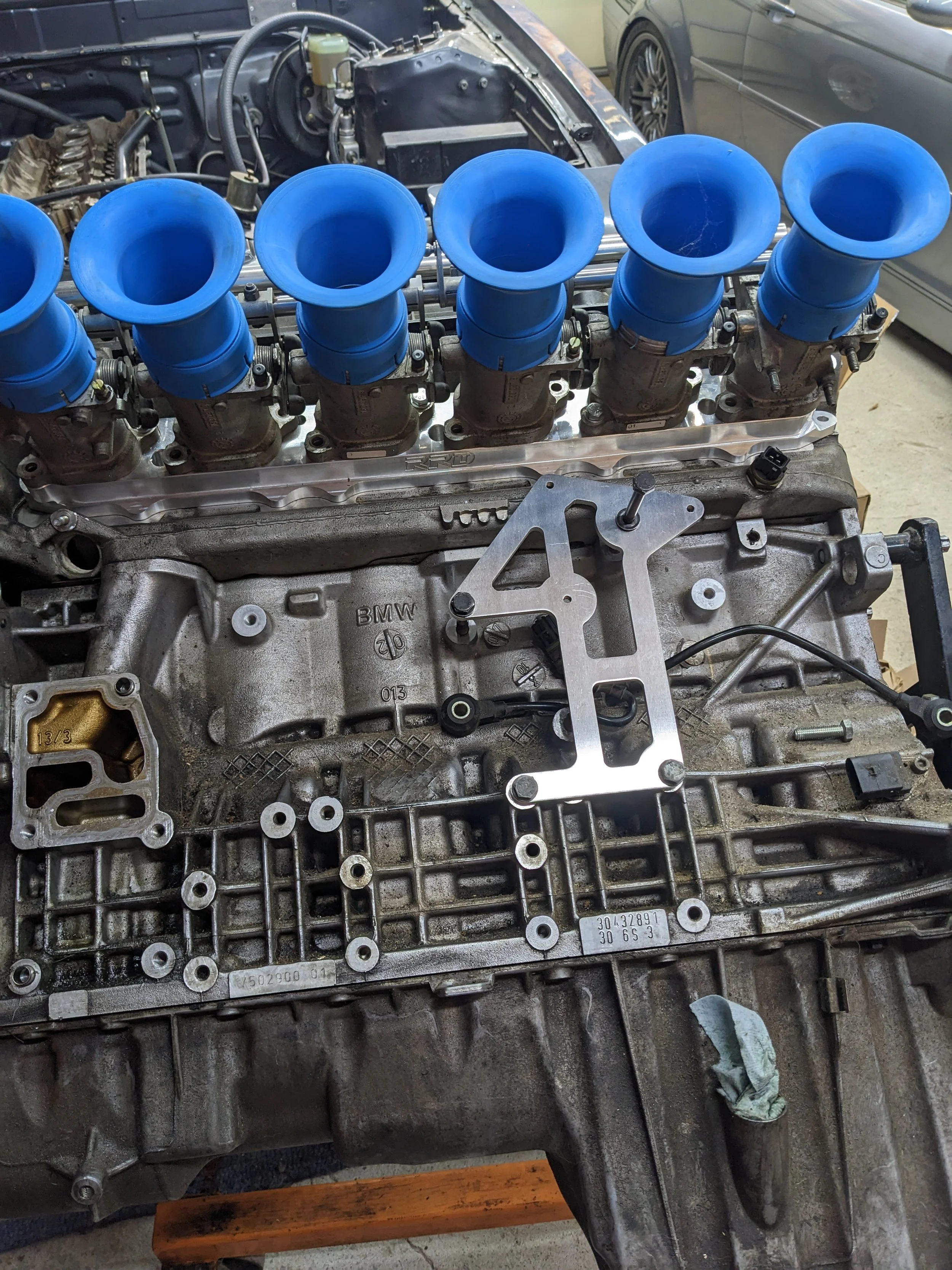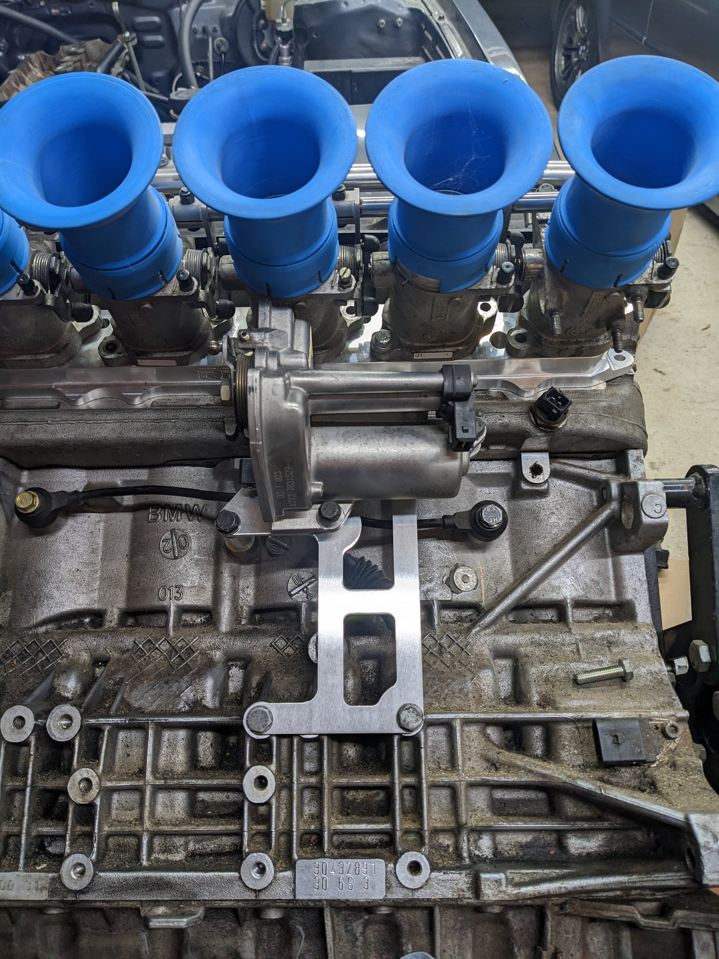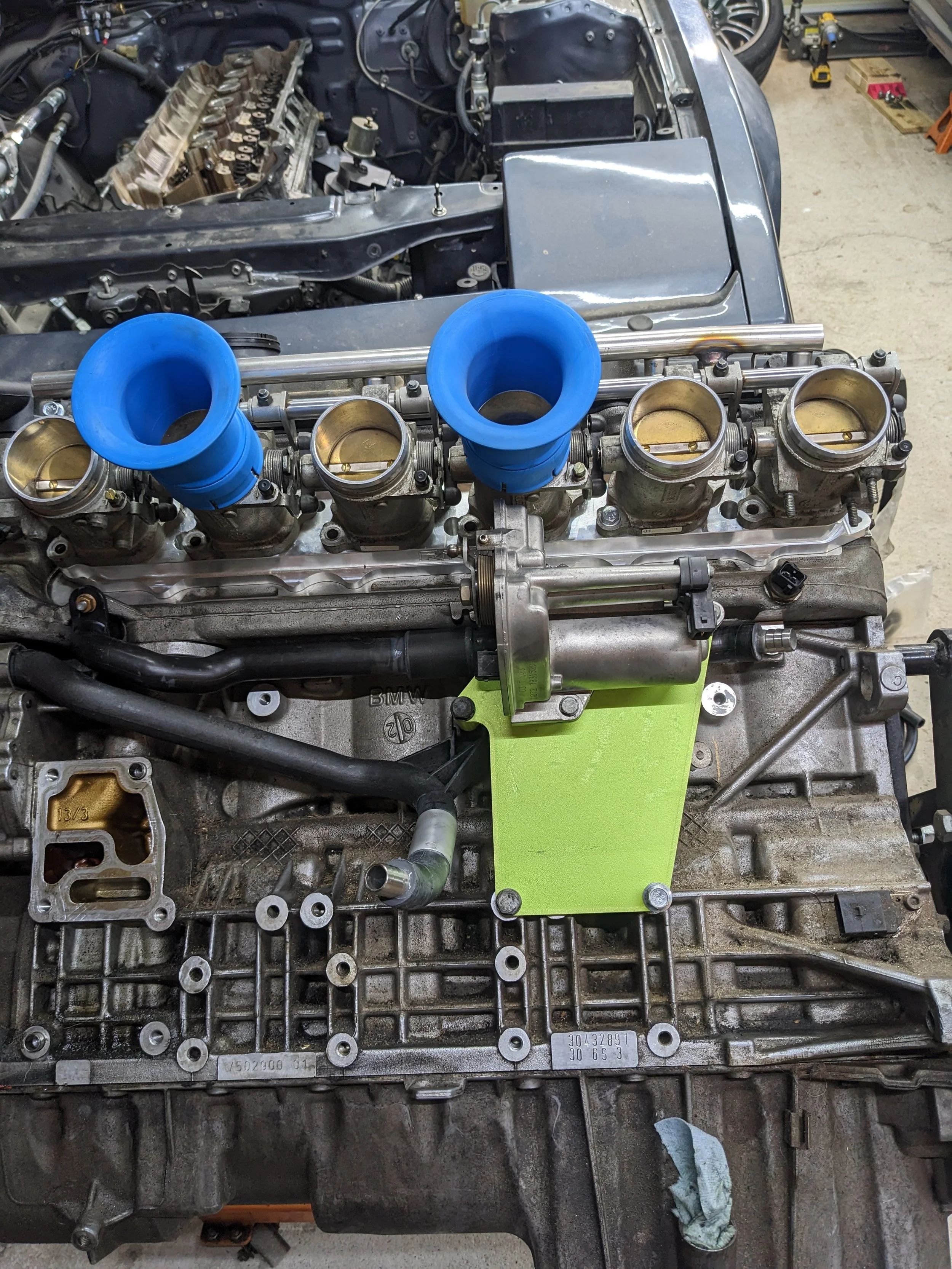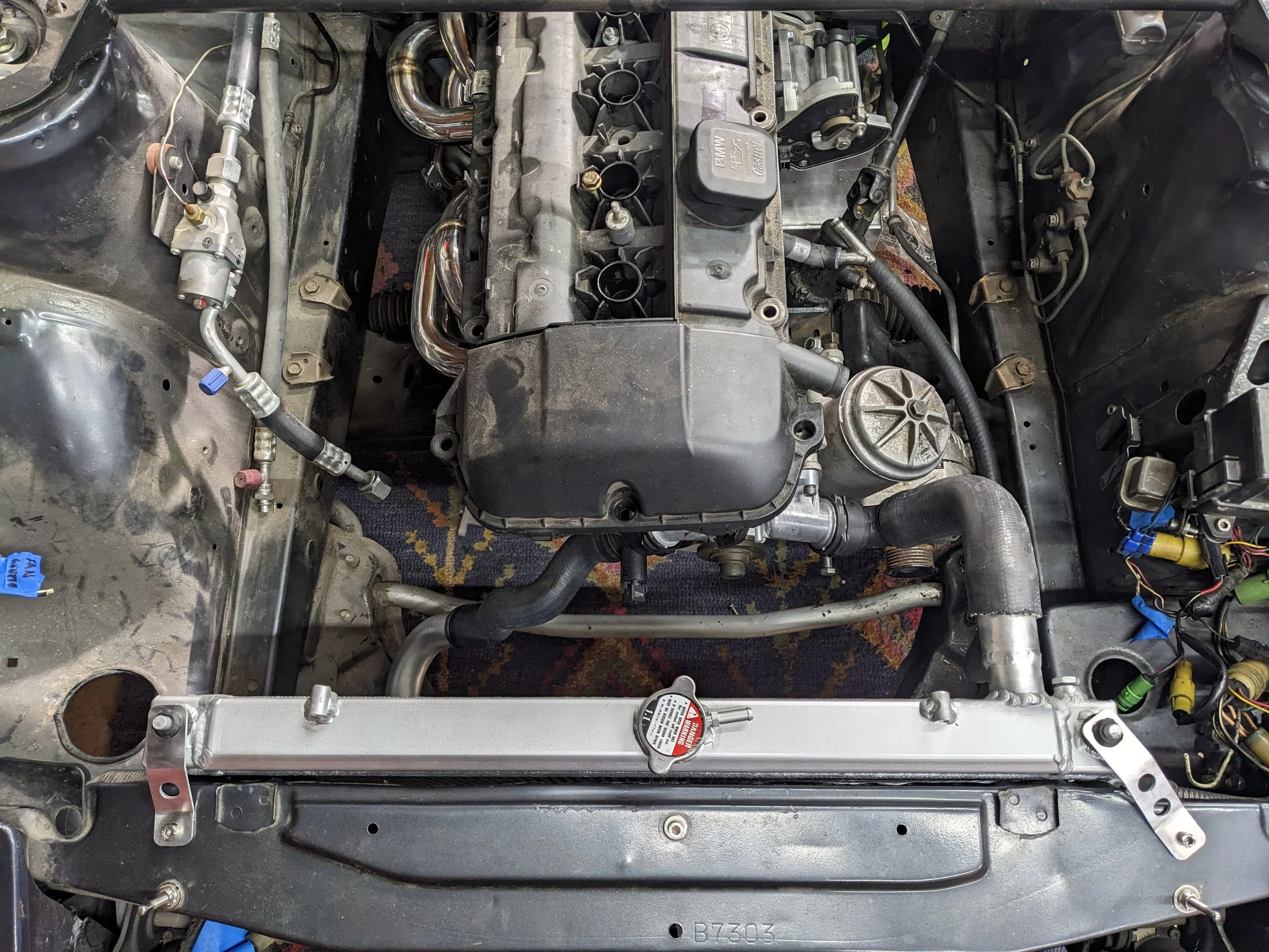 Some minor radiator mods were needed to make an E39 lower hose work. I also added a 5/8in barb for the heater core return. The upper hose is a trimmed SN95 Mustang upper and the lower is stock E39 M54. I cut the quick disconnects off some OE hoses to adapt to the M54 outlets. This also allows me to use the stock M54 coolant temp sensor.