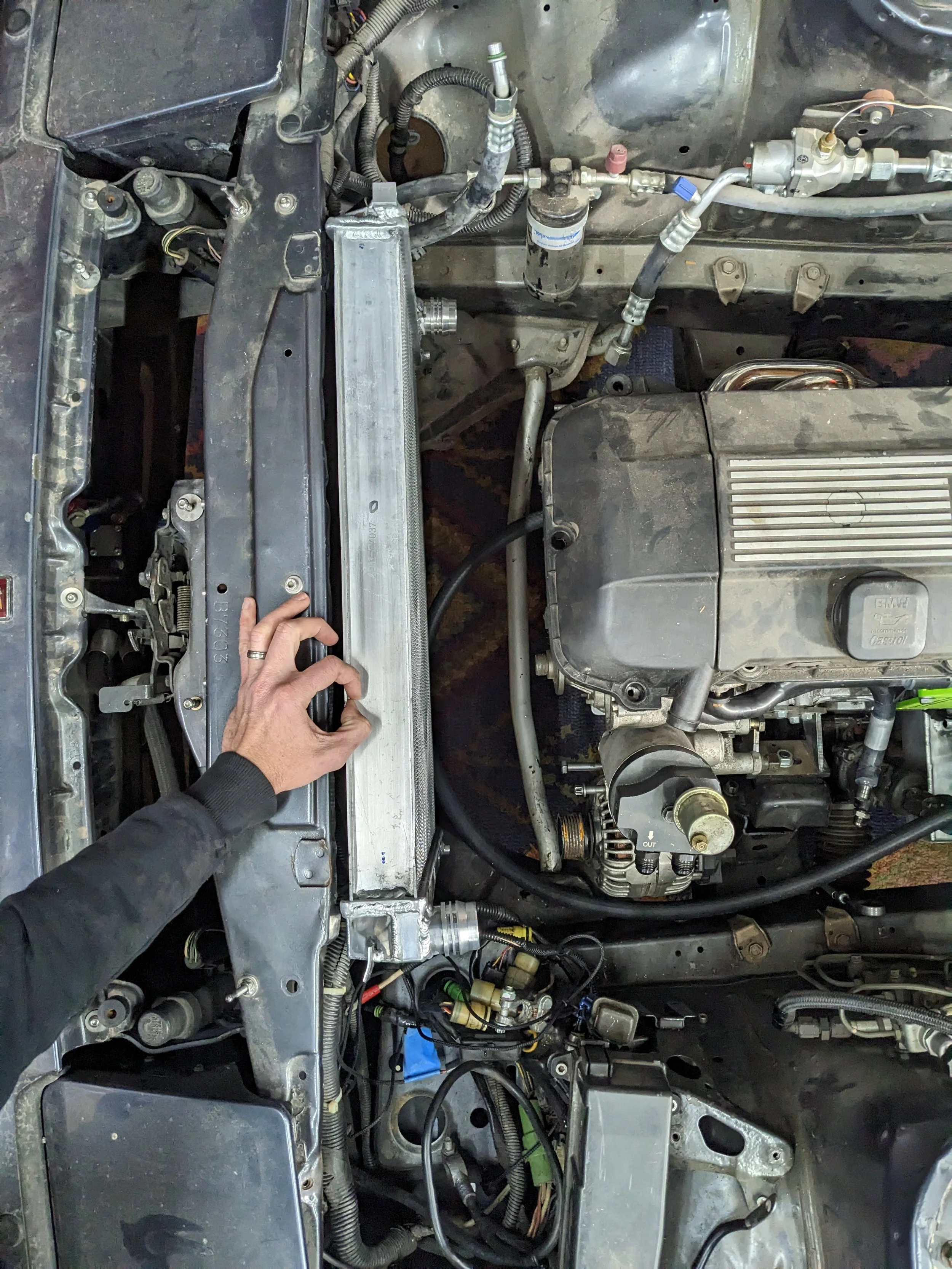 Originally, I hoped to use an E46 radiator and expansion tank. Contrary to internet lore, these parts were quite reliable in my old 330i and easily went 100k miles on a DD street/track car without issues. I bought a cheapo eBay E46M radiator and some OEM 330i hoses and tank but they just didn’t fit how I wanted. Radiator was the perfect size though.