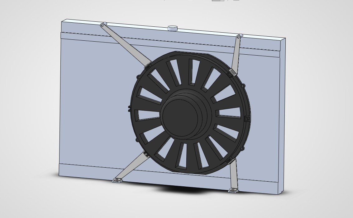 The last major portion of the cooling system was the fan. I bought a Spal 13in/1777CFM puller which should be enough. Modeled everything up as it was far quicker than scanning and designed some brackets. The parts below are PLA check pieces. I will get these made from .09in aluminum.