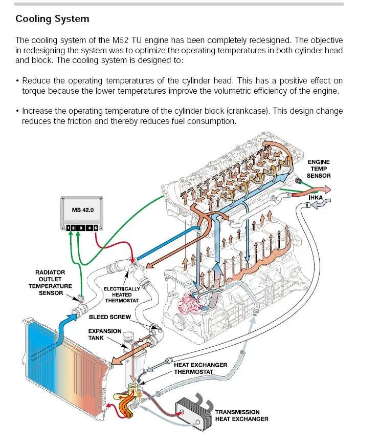 Unsurprisingly, the stock BMW system is more complicated than the LS or the 5MGE. The M52TU is shown below but it is largely the same between the the M54 and M52TU. It uses an expansion tank as well as an additional exit port on the engine. Unlike the LS/5M, the heater core runs back to an expansion tank rather than to the engine or water pump. In the E39, a secondary water pump is used to circulate coolant when the engine isn’t running. This helps keep the heater core warm when the car is parked.