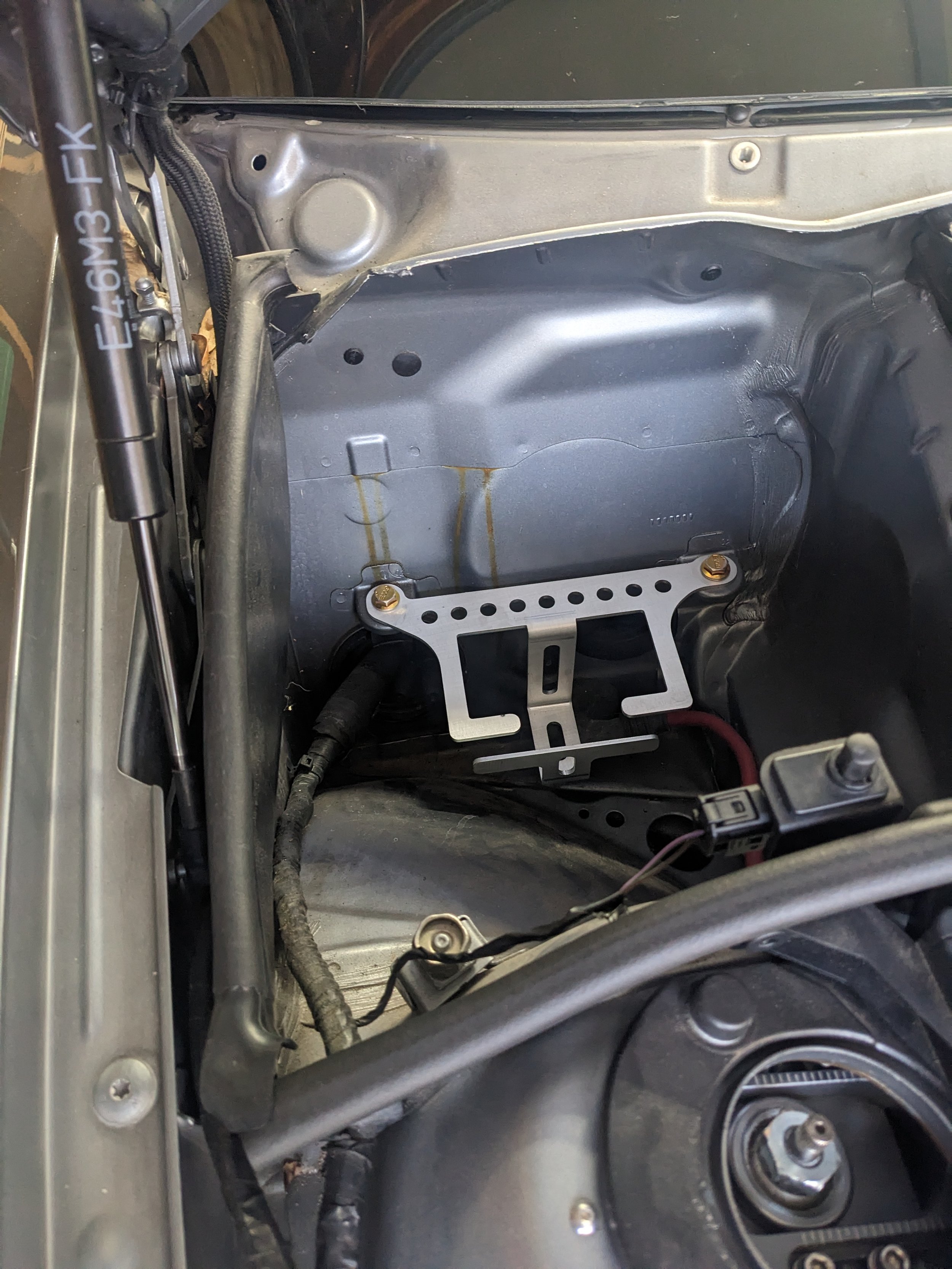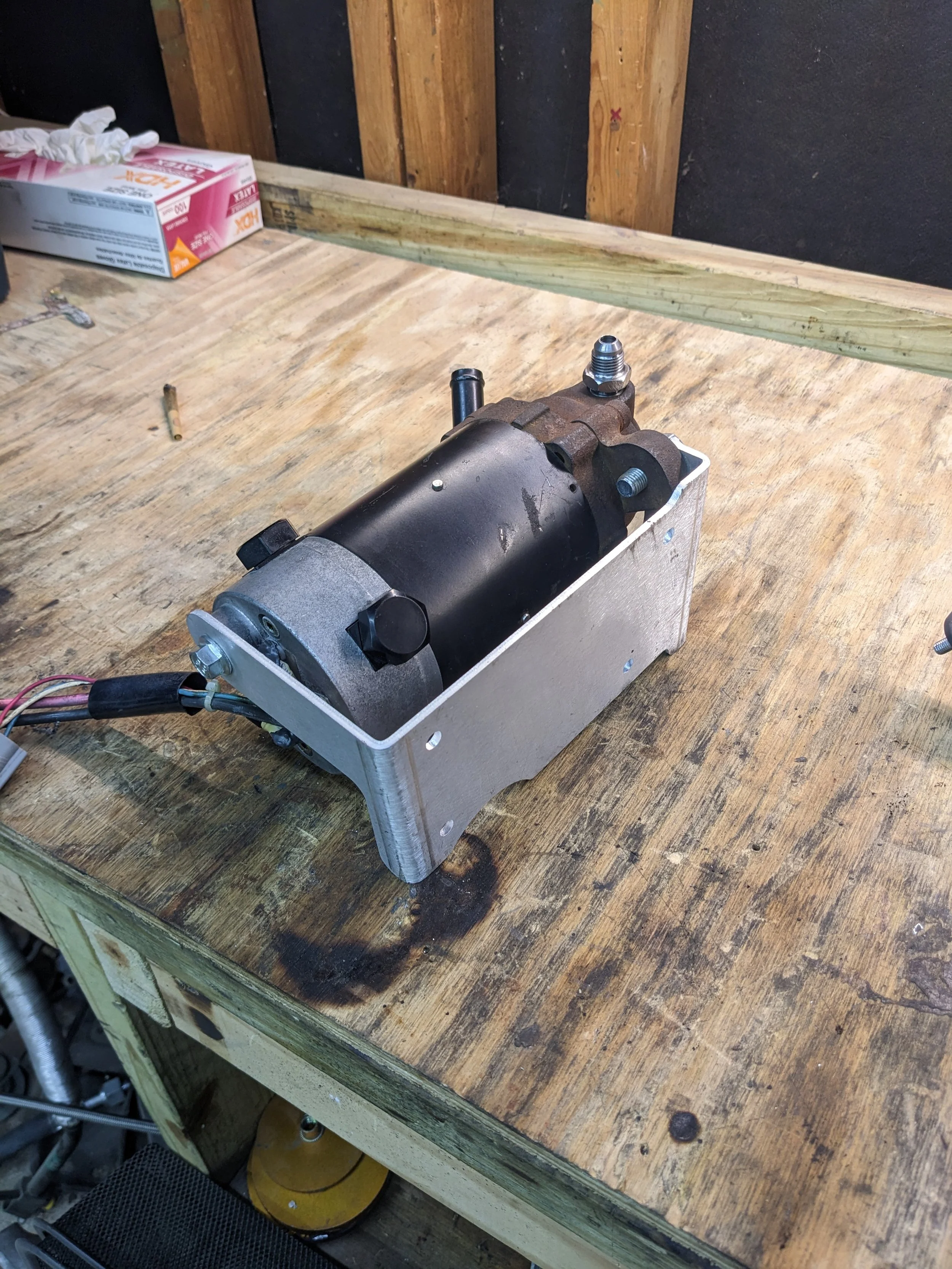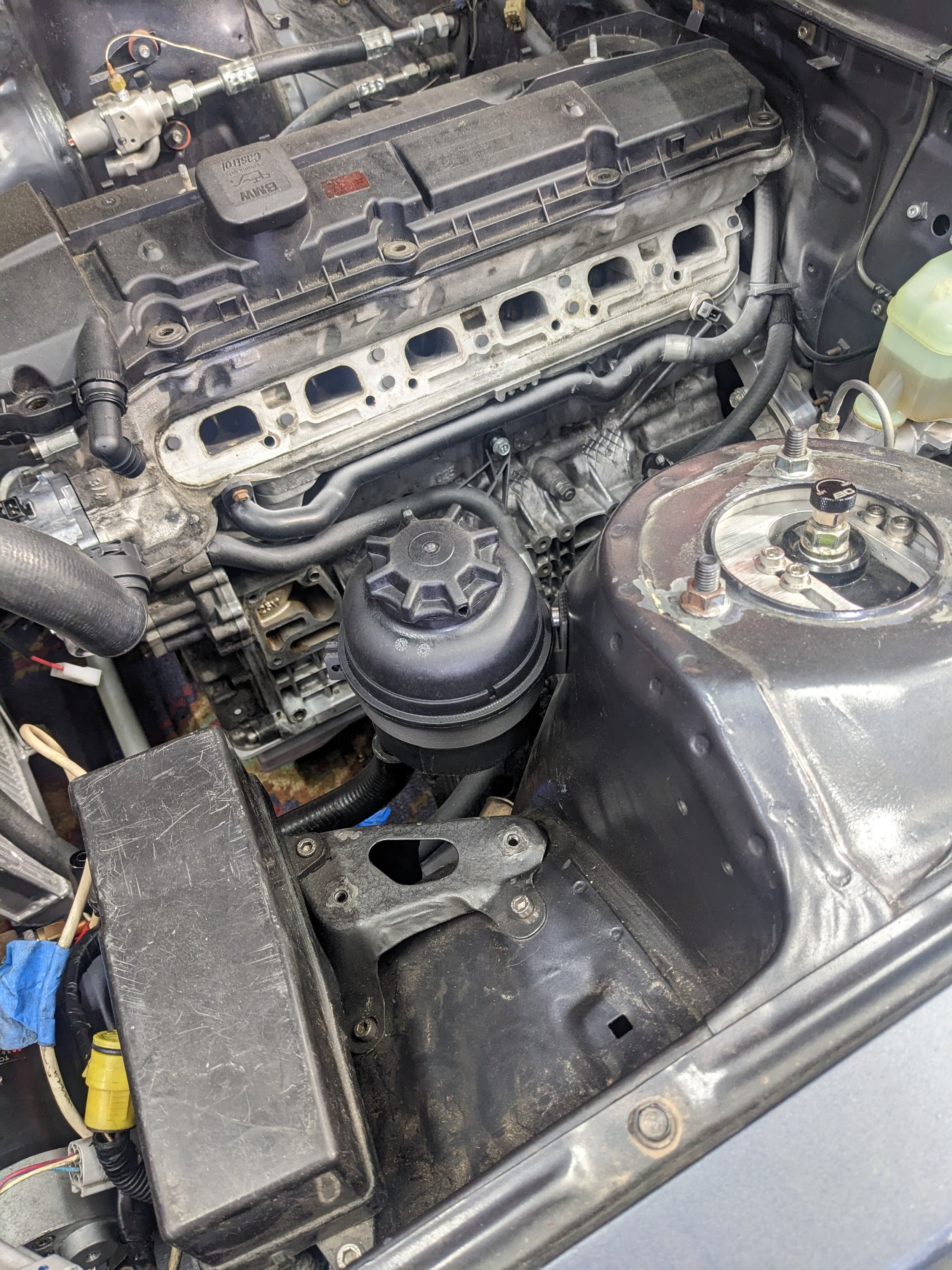 I’m planning on using an E46 PS reservoir. These are notoriously leaky so I guess I’m a glutton for punishment. Printed up a bracket in PA6-CF but I will be making revision 2 once I get revision 2 of the pump bracket.