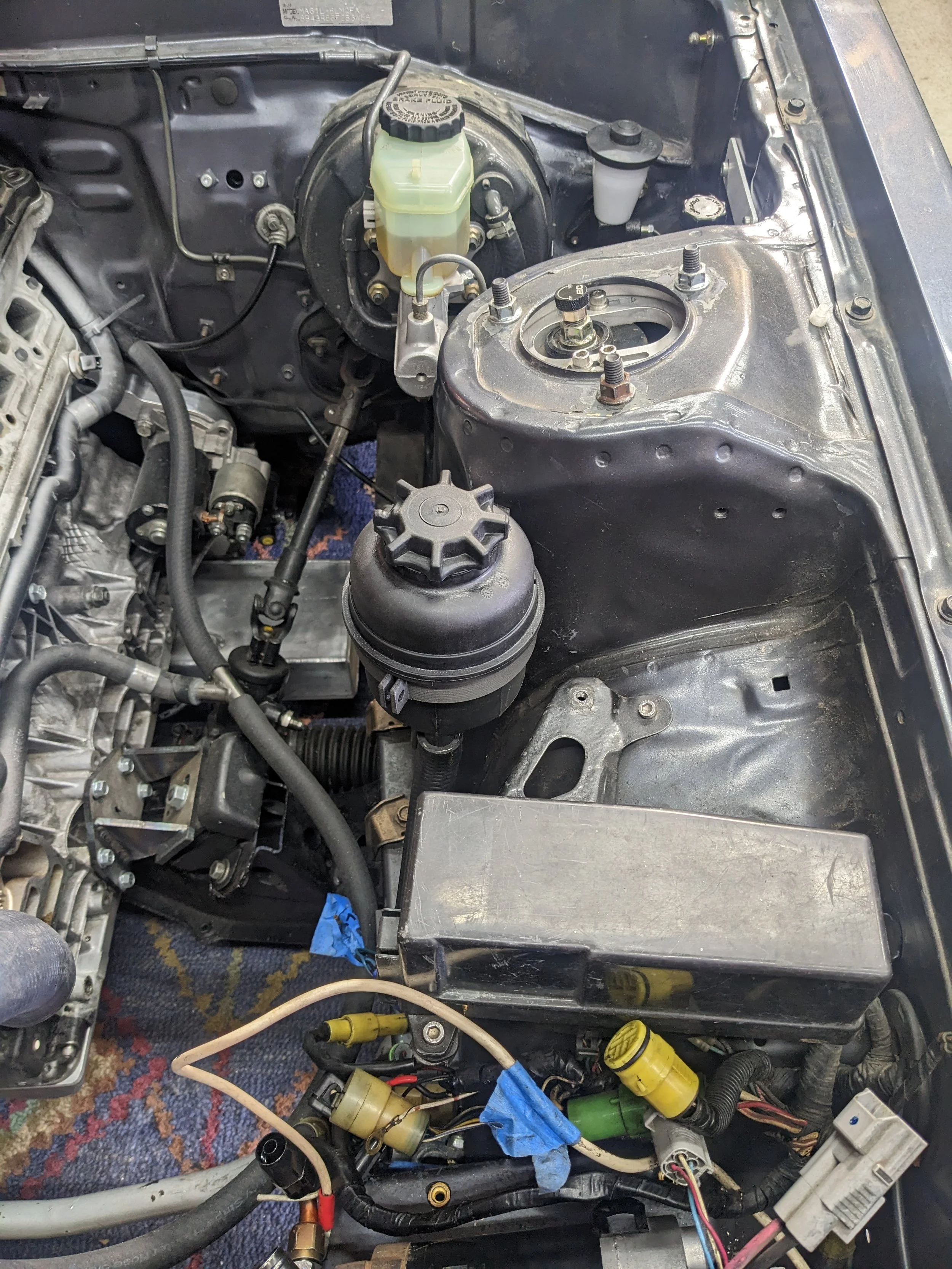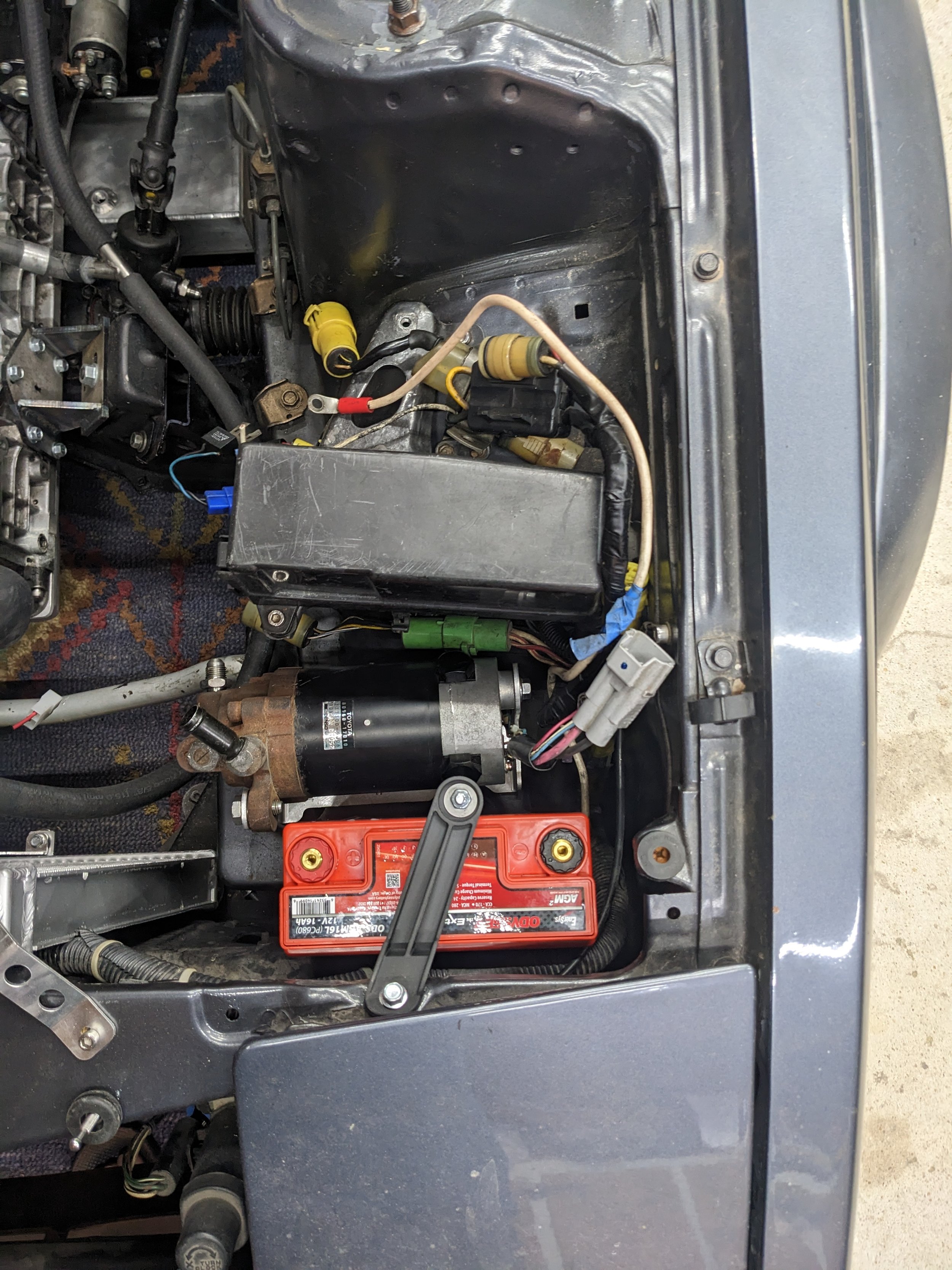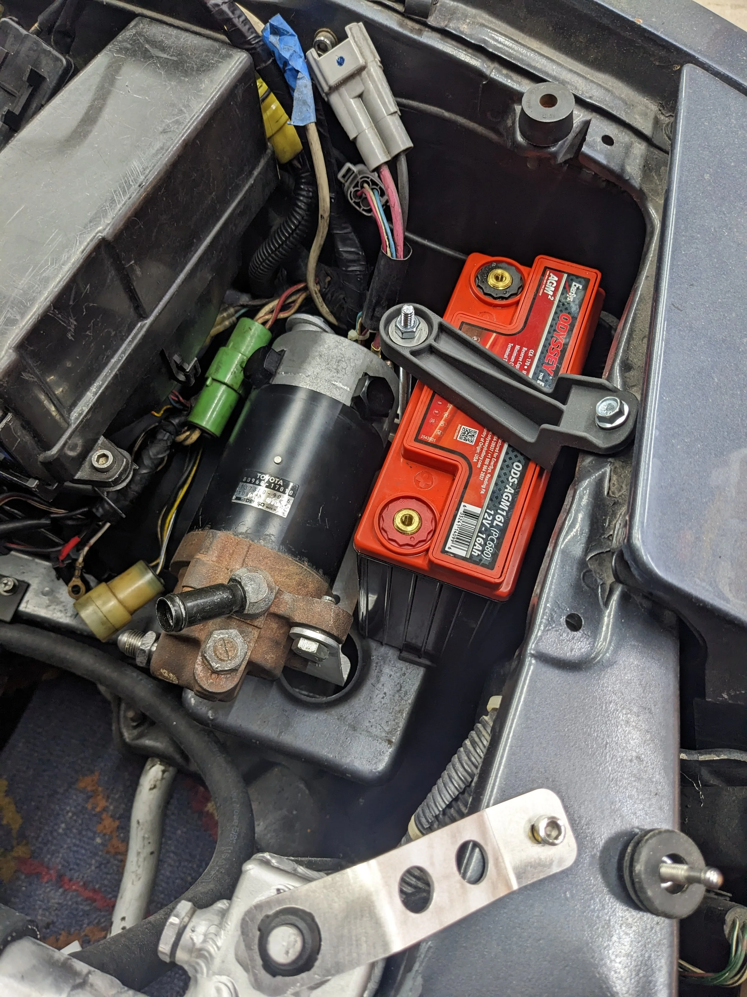 The power steering had me a bit hamstrung on the swap. I couldn’t use the M54 pump/bracket because it would hang below the crossmember now that the engine was sitting upright. The lack of bosses on the left side of the motor meant I would need to move the PS pump to the right side and likely ditch AC. Electric assist column or electric pump were other options. I modeled up a GM Type 2 pump and Honda K-series pump but I could not find a good way to mount either to the block without another expensive machined part so I decided to go the electric PS pump route. I bought a Volvo S60 pump a year or so ago but it’s so large that I couldn’t make it work. The SW20 pump ended up fitting nicely next to the Odyssey PC680 battery that I will use. I’m not sure if I will just run this pump in the default on/off setting or add CAN/VSS communication. The new battery is not as light as a lithium unit but it was less than $200. The battery and PS pump together weigh about as much as the original 24F battery. This car will stay on a tender when not driven so I’m not really worried about battery life or cold starts.
