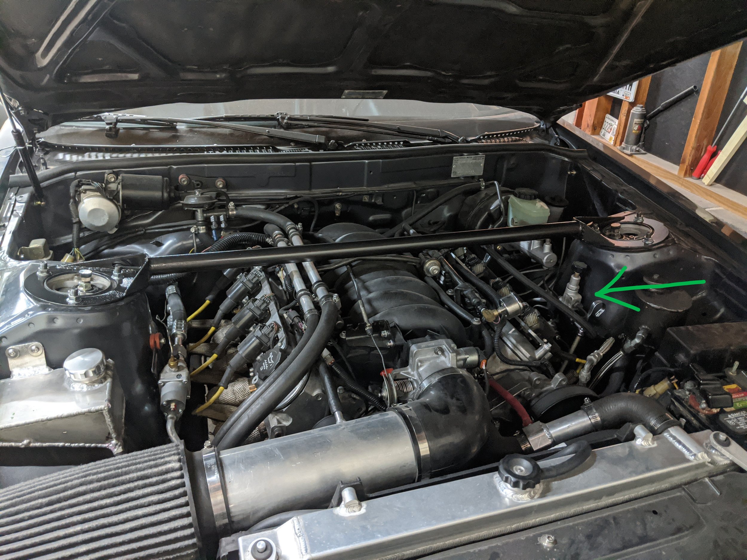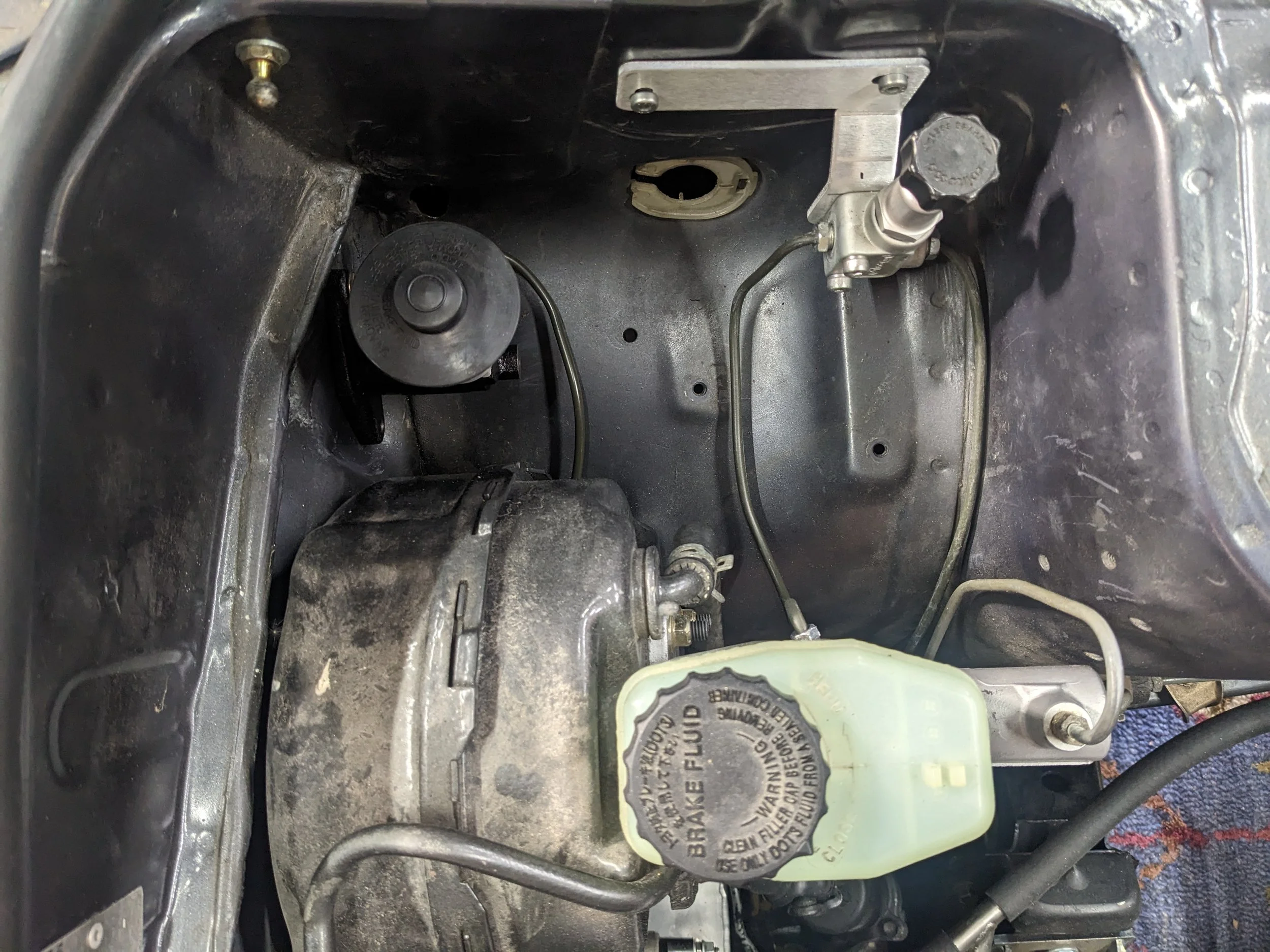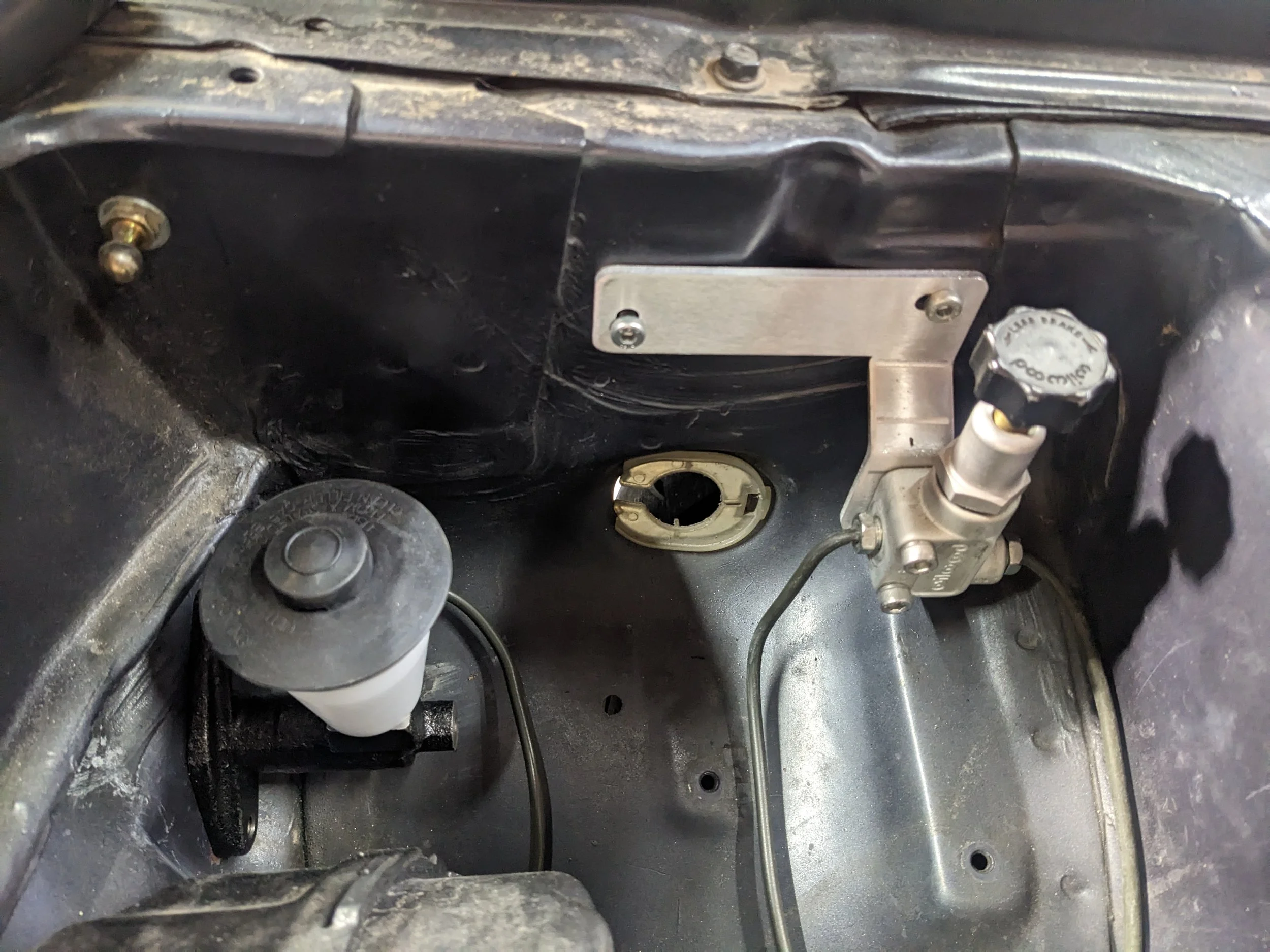 Re-mounted the prop valve for the junkyard BBK that’s on the car. Previously, it was located on the inside of the strut tower with a stack-up of random nuts and washers. Besides being janky, the old location was not great for clearance with the new swap. There are a few improvements I want to make to the brakes after the engine gets finished. These pictures do a great job documenting how dirty everything is. More to come here also…